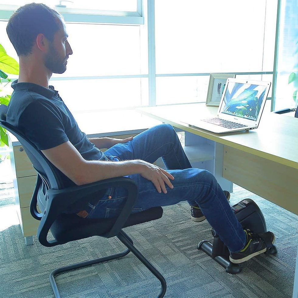 Don’t use that stack of work on your desk as an excuse not to get your exercise in. This under-desk mini exercise bike goes wherever you go, allowing you to get in some movement even if you are strapped to your desk. It features an LCD screen display and an adjustable tension knob to take it easier or make it more challenging. The non-slip pedals will help keep your feet in place.