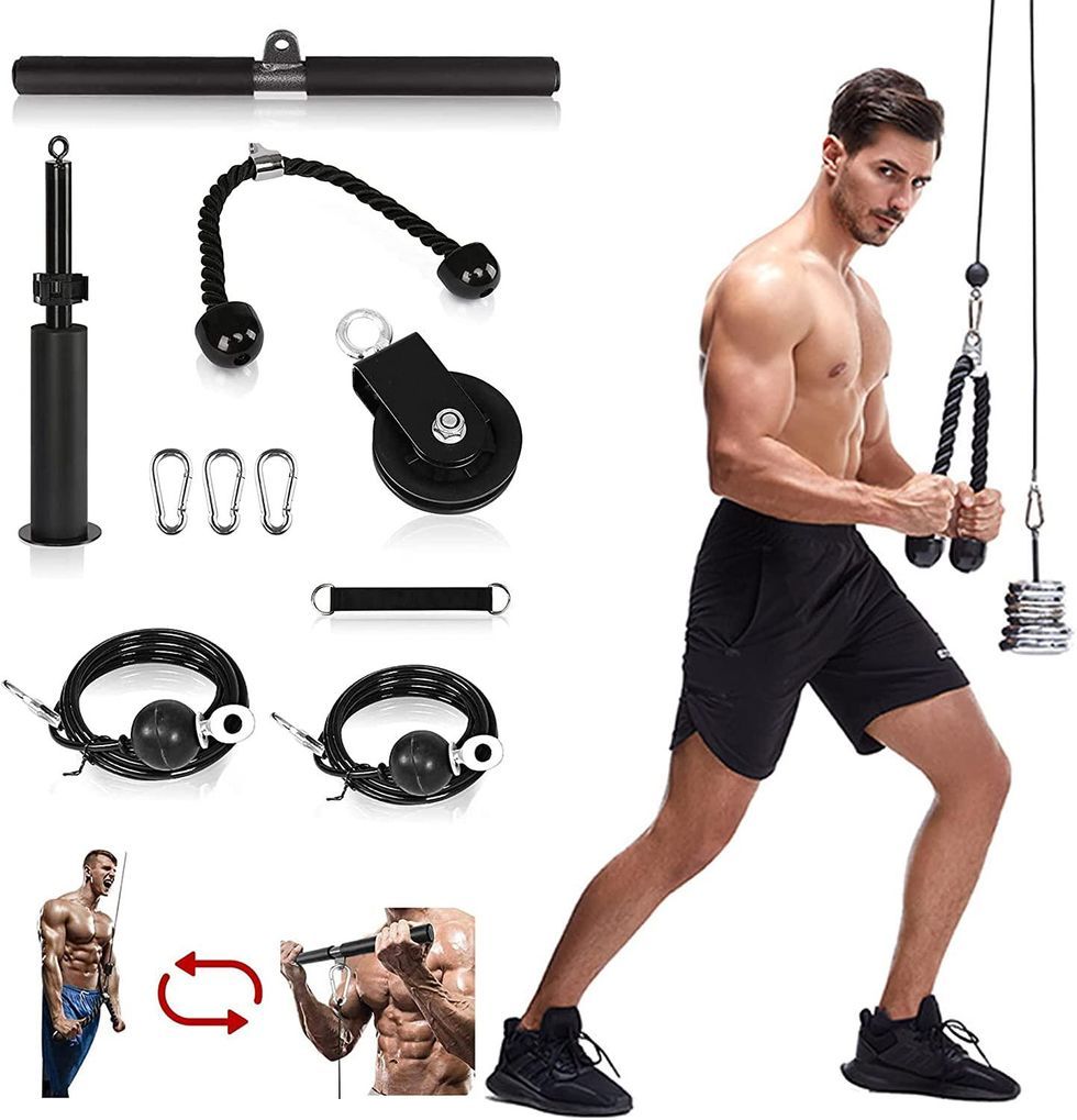 Put a pulley system in your home gym and whip your biceps, triceps, shoulders, and back into shape — pronto. This set supports up to 440 pounds of weight, making it an ideal choice for beginners or more advanced fitness gurus. Purchase this and you’ll get a straight bar, two lengths of cables, a tricep rope, and a silent pully. Connect it to power racks, pull-up bars, beams, or any free spot you have available.