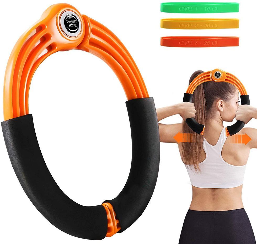 You can work out your arms anywhere, so says this fitness arm ring that weighs in at a minuscule 1.5 pounds. Work out at home? Check. Take it to the gym? Why not. Try to squeeze in some reps in the car? As long as you aren’t driving. This fitness ring has a tension of 44 pounds and includes three resistance bands of varying weights. And, surprise! You can use this for working out your legs, too.